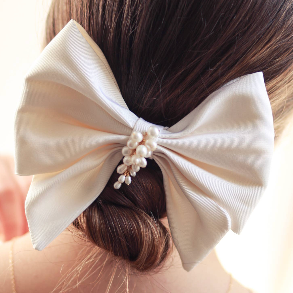 Classic and refined, The Margot Bow Barrette is handmade from 100% ivory silk faille and features a beautiful handcrafted genuine freshwater pearl center. A more demure and simplified version from the Calliope Bow, yet still makes a statement. It's a beautiful alternative to a veil or for a reception. Pairs well with the Baroque Pearl Mini Hoops