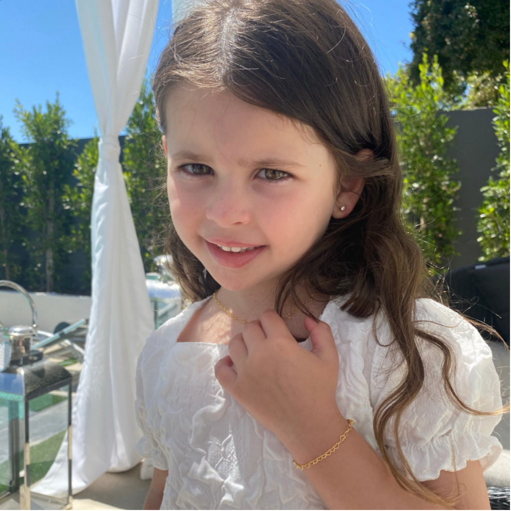 This heart bracelet is the perfect piece for your little one. It has endless amount of hearts, just like the endless love you give.