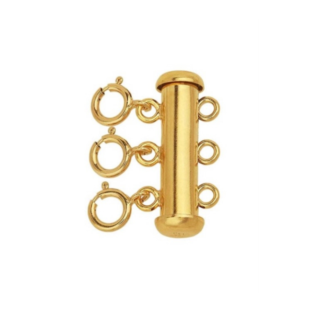 This gold-filled tube slide clasp makes it easy to create layered looks and switch them up. One side features two spring rings while the other features three jump rings, spaced to show off chains and necklaces without tangling. The tube clasp offers a strong, secure closure. This clasp is plated with 14-karat yellow gold to ensure a uniform color.