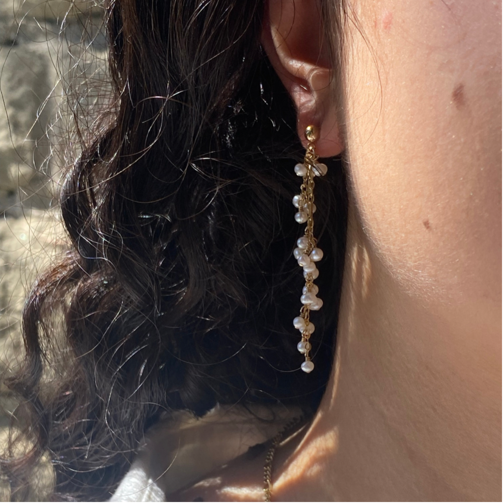 A triple strand earring with sporadic signature clustering in freshwater pearls. Lightweight and comfortable to wear. Due to the nature of pearls, each pair will be slightly different, lending to a one of a kind design.