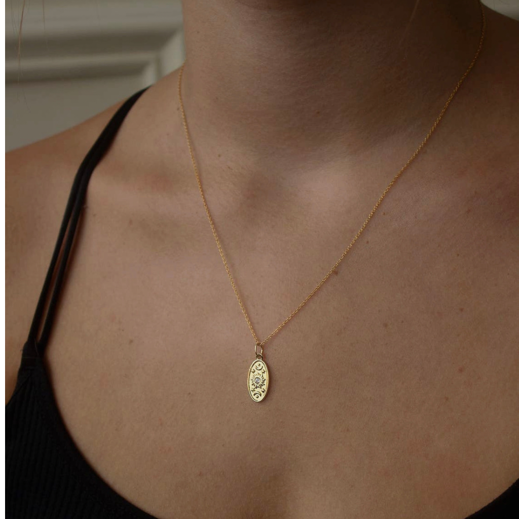 This dainty and minimal necklace features an oval pendant with moon, sun and stars. Adorned with a dainty center cz stone. Perfect for layering!